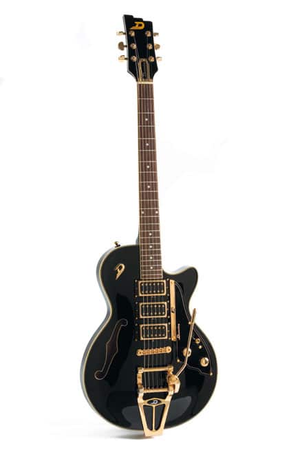 Sicherlich ist nicht nur mir auf dem Frankfurter Messestand diese edle Duesenberg Starplayer TV ins Auge gefallen. Schwarz, drei Humbucker, Vibrato und goldene Hardware?! Kommt mir irgendwie bekannt vor, spielt jedoch angesichts von Halbakustik-Body, Hardware bzw. Applikationen im Art-Deco-Stil und einer simplen aber ausgefuchsten Schaltung in einer anderen Liga.