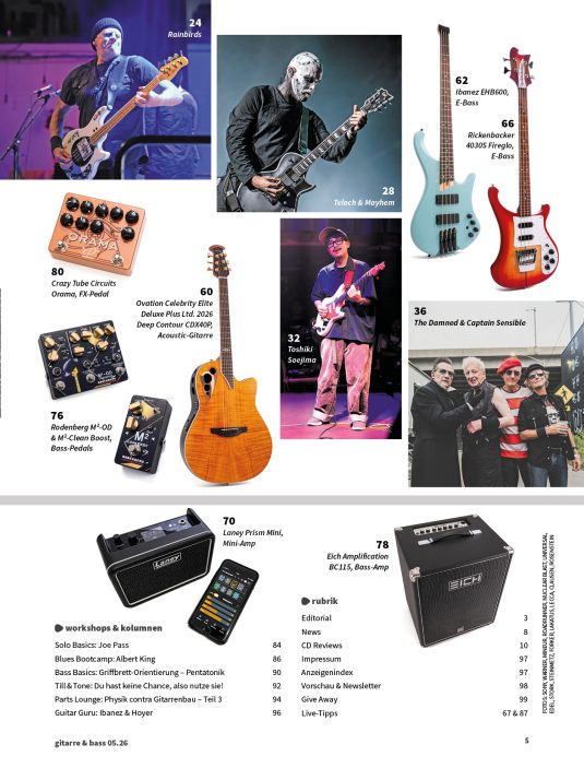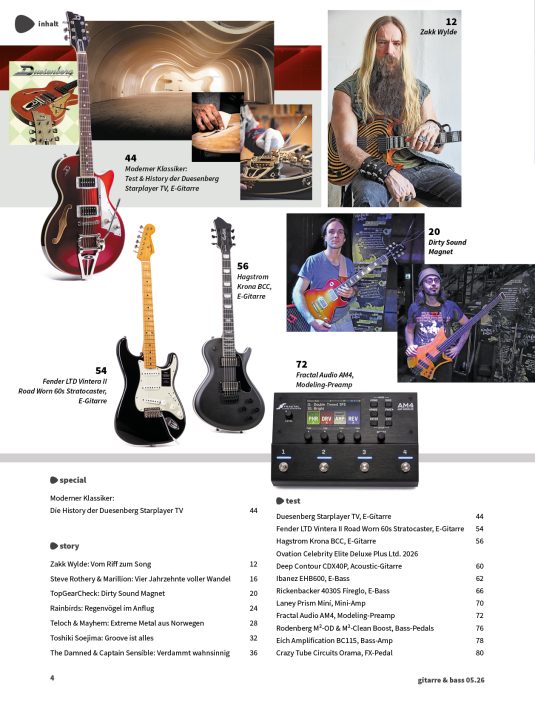 IM TEST: Laney Prism Mini +++ Fractal Audio AM4 +++ Hagstrom Krona BCC +++ Ibanez EHB600 +++ Duesenberg Starplayer TV +++ Fender LTD Vintera II Road Worn 60s Stratocaster +++ Rickenbacker 4030S Fireglo +++ Rodenberg M²-OD & M²-Clean Boost +++ Ovation Celebrity Elite Deluxe Plus Ltd. 2026 Deep Contour CDX40P +++ Eich Amplification BC115 |- Download