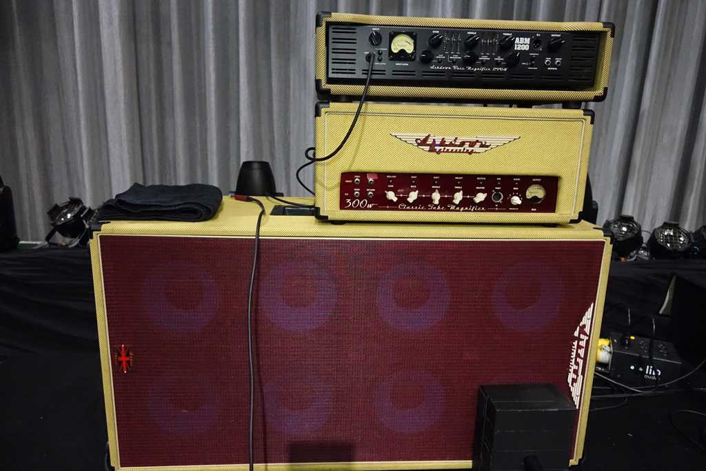 Ich hatte immer schon einen Ashdown-Head, ich glaube, anfangs war es ein ABM600-Head, den ich mir damals selbst gekauft habe. Mein Vorgänger Michael Rhodes stand ja in engem Kontakt zur Firma, und als er Joe verließ und ich für ihn kam, war der logische Schritt, mit Ashdown zu sprechen und sie um Unterstützung zu bitten. Am Anfang habe ich irgendetwas bekommen, was Michaels Gear ähnlich war, irgendeinen 300-Watt-Head. Dann bin ich zum ABM 1200 gewechselt, einem Solid-State-Head mit einer Röhren-Pre-Section. Ich finde, er passt in der Art und Weise und auch in der Lautstärke, mit der ich spiele, perfekt zu den anderen Jungs auf der Bühne. Er klingt nur ein bisschen tighter und cleaner und ist weniger anfällig für wegfliegende, Feedback-artige Noten. Joe hat fünf oder sechs Dumbles und einige Marshalls, also eine Menge Zeugs. Mit dem ABM 1200 gelingt es mir, ihn zu unterstützen, ohne in sein tonales Territorium einzudringen.