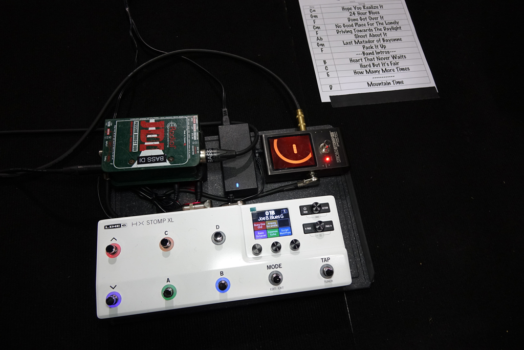 Daher habe ich das Gefühl, dass es besser ist, einen möglichst gleichbleibenden Sound anzubieten. Ich spiele also nicht viel mit Effekten, denn erstens soll der Fokus auf Joe, Josh und Reese liegen, außerdem: Wenn Joe und Josh zum Beispiel verzerrt spielen, und ich mich diesem Sound anschließen würde, entstünde ein großes Klangchaos. Für mich ist es eher wichtig clean zu spielen und eine Art Taschenlampe in der Dunkelheit zu sein, die dafür sorgt, dass der Weg nach Hause führt, wenn du verstehst, was ich meine. Deshalb setze ich allein auf den HX Stomp XL von Line 6, der zwar viele Möglichkeiten bietet, von denen ich aber nur einige wenige gelegentlich nutze. Es gibt in der Show kurze Momente, in denen ich einen Octaver oder einen Phaser einsetze, vor allem in ruhigen Momenten, um dem Song ein wenig Textur zu geben. Eigentlich spiele ich aber fast durchgehend clean ohne Effekte.