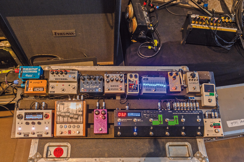 Ich habe einen weiteren Live-Amp, den Two-Rock Classic Reverb Signature, den jemand in Hamm bei Münster verkauft hat. Ich bin hingefahren, habe ihn angespielt und nach dem ersten Akkord gewusst: Okay, der ist es. Den spiele ich jetzt neben meinem Friedman und Tone King. Außerdem habe ich mein ganzes Pedalboard neu gemacht, früher hatte ich das G-System von TC Electronic.