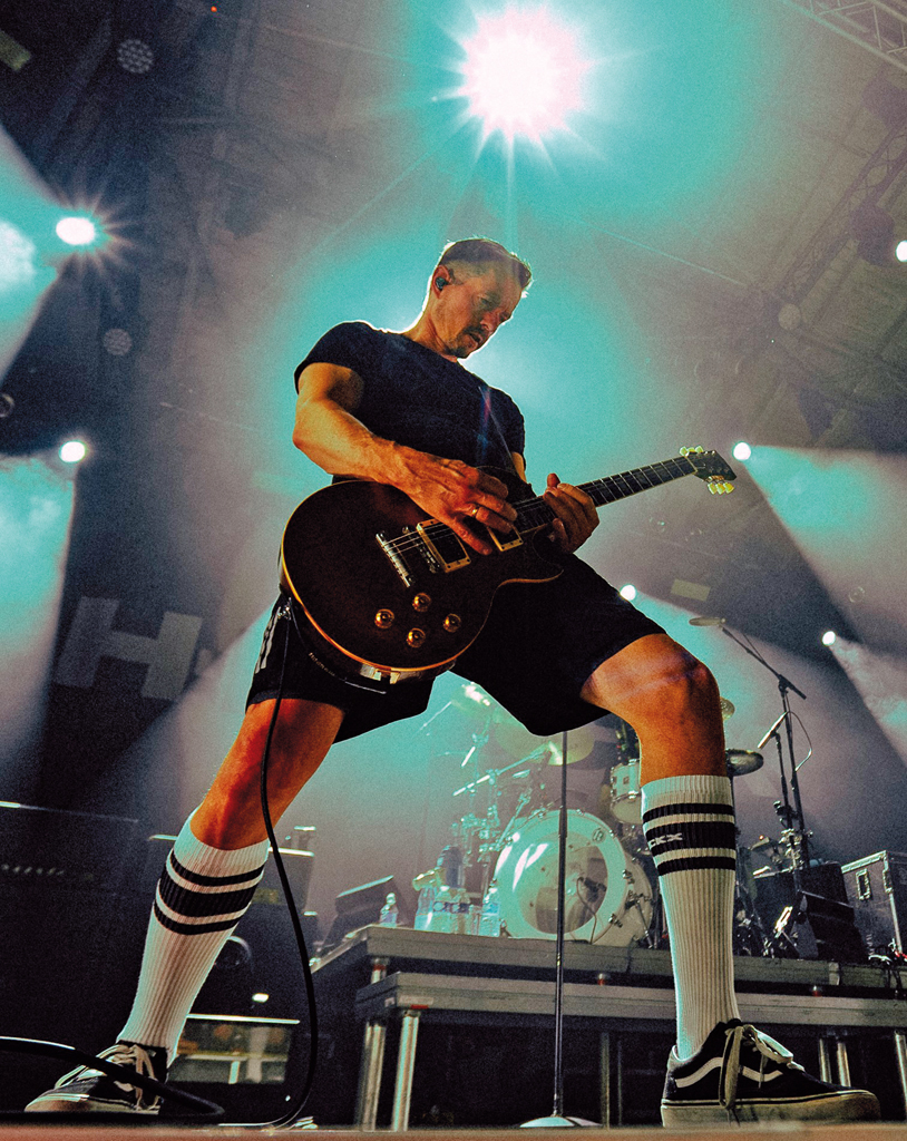 Da hat sich wirklich seit 20 Jahren nichts geändert. Die Les Pauls sind seit Anfang/Mitte der 90er im Sortiment. Die Goldtop hat standardmäßig 500T-Pickups verbaut. Die nutze ich vor allem für die Songs, die etwas mehr Gain benötigen. Die Keramik-Magnete machen genau den Grad Zerre, ohne dass am Amp geschraubt werden muss oder ein Drive-Pedal zum Einsatz kommt. Die Les Paul Standard von 1992 habe ich bei den Recordings zum ‚Time To Move‘-Album benutzt und nun auch wieder auf der Bühne. ES-335 als etwas offenere, perkussivere Variante. Strat und Tele kommen wirklich nur sehr vereinzelt bei bestimmten Songs zum Einsatz, zuletzt jeweils nur ein bis zwei Mal je Show.