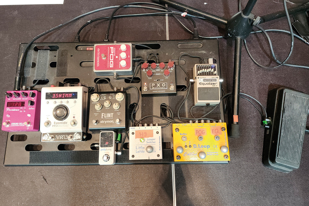 Häufiger gefordert sind Eventide H9, Providence-Delay, Boss-EQ, J. Rockett PXO Phil X Signature. Strymon Flint / EHX POG / Fulltone 69 Fuzz kommen in speziellen Parts zum Einsatz.