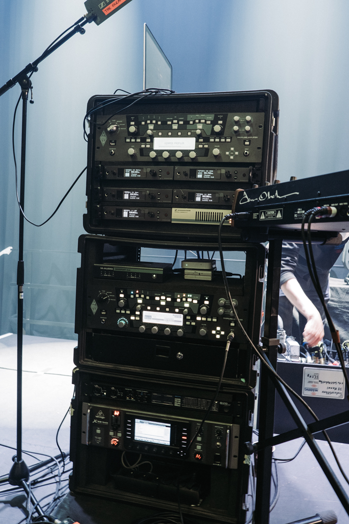 Am Anfang steht ein Macbook mit Logic Pro, das uns als Sequenzer dient. Der gibt den Clicktrack raus, spielt Backing-Tracks ab, steuert das Licht und schaltet unsere Gitarrenamps und -effekte um, ist also mit den Kempern gesynct. Der ist aber auch mit Loïcs (Sänger der Band, Anm. d. Red.) Laptop verbunden, der damit Vocal-Effekte in Realtime macht. Das ist das zweite Macbook. Und als letztes kommt Peters Macbook. Er spielt Keys und Synthesizer, benutzt aber auch Ableton Live für Loops und eigene Live-Geschichten. Die drei sind also alle miteinander verbunden, das Logic-Macbook ist aber das Herz der ganzen Sache.