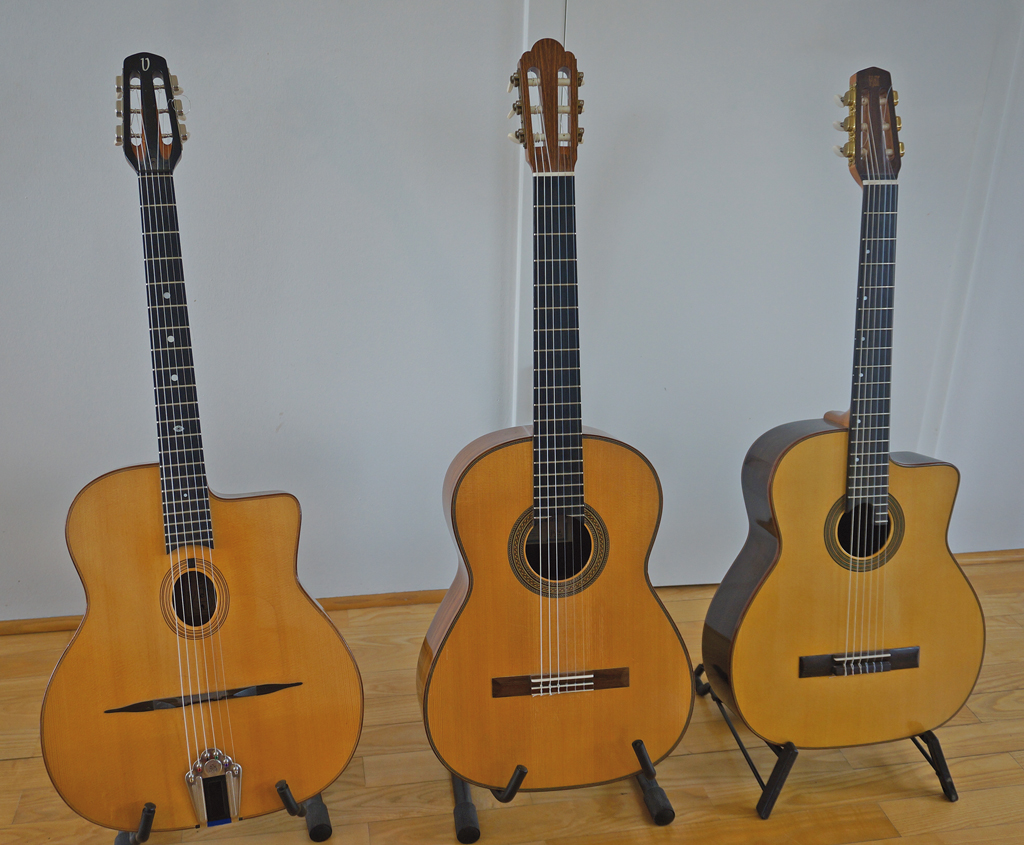 Ich habe außerdem noch weitere tolle Instrumente von deutschen Instrumentenbauern: Jürgen Volkert aus Nürnberg baut Gypsy-Gitarren. Joscho Stephan beispielsweise spielt nur seine Gitarren. Dann noch eine Gitarre von Thomas Amberger aus dem Bayrischen Wald und eine von Manuel May, der seine Werkstatt auf Föhr hat. Seine Gitarren sind in Gypsy-Bauweise, aber mit Nylonstrings, das gibt einen superweichen Sound.