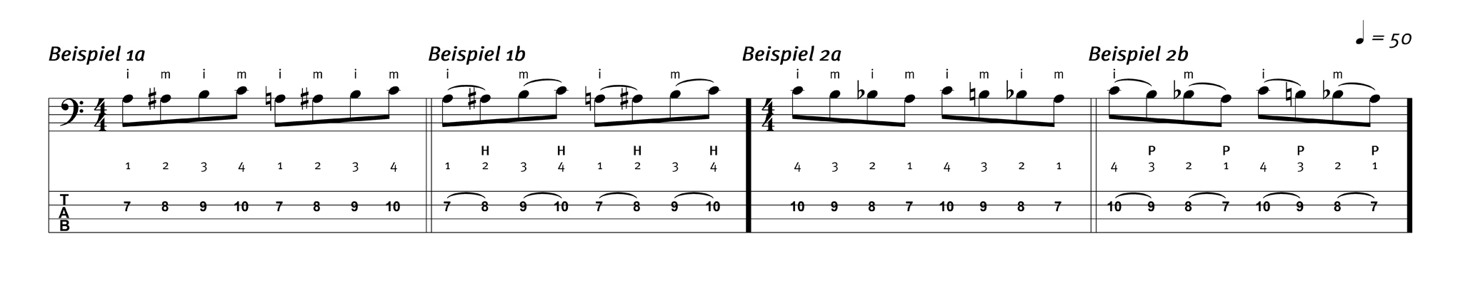 Zunächst stelle ich dir immer die Übung bzw. den Fingersatz ohne Aufgaben für die Greifhand vor. Danach findest du in Beispiel b immer die gleiche Übung mit Hammer-Ons und Pull-Offs.