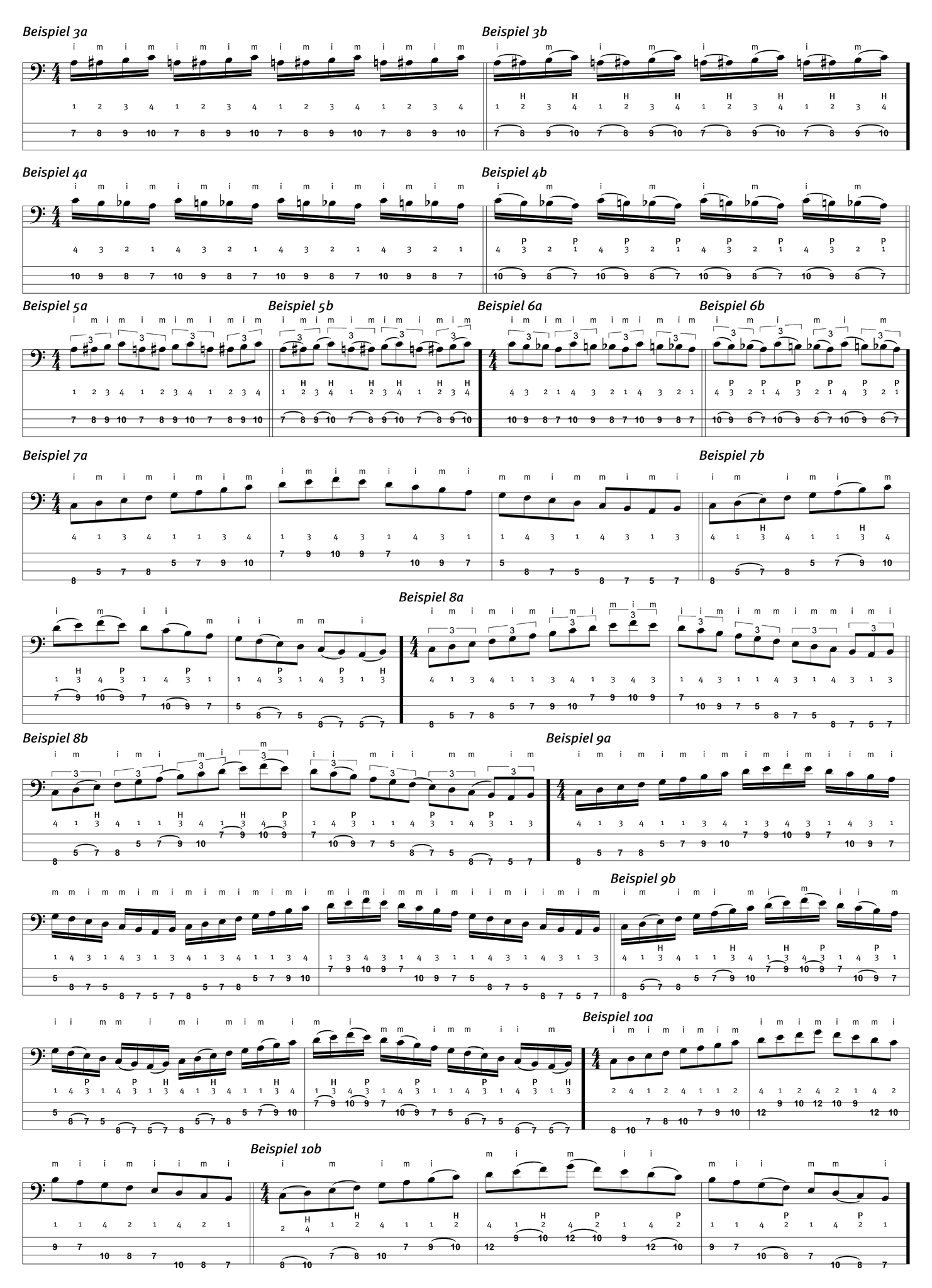 Zunächst spielen wir uns mit dem Fingersatz 1-3-4 durch die Fingerpatterns. In den Beispielen 10a und 10b spielst du dann mit dem Fingersatz 1-2-4.