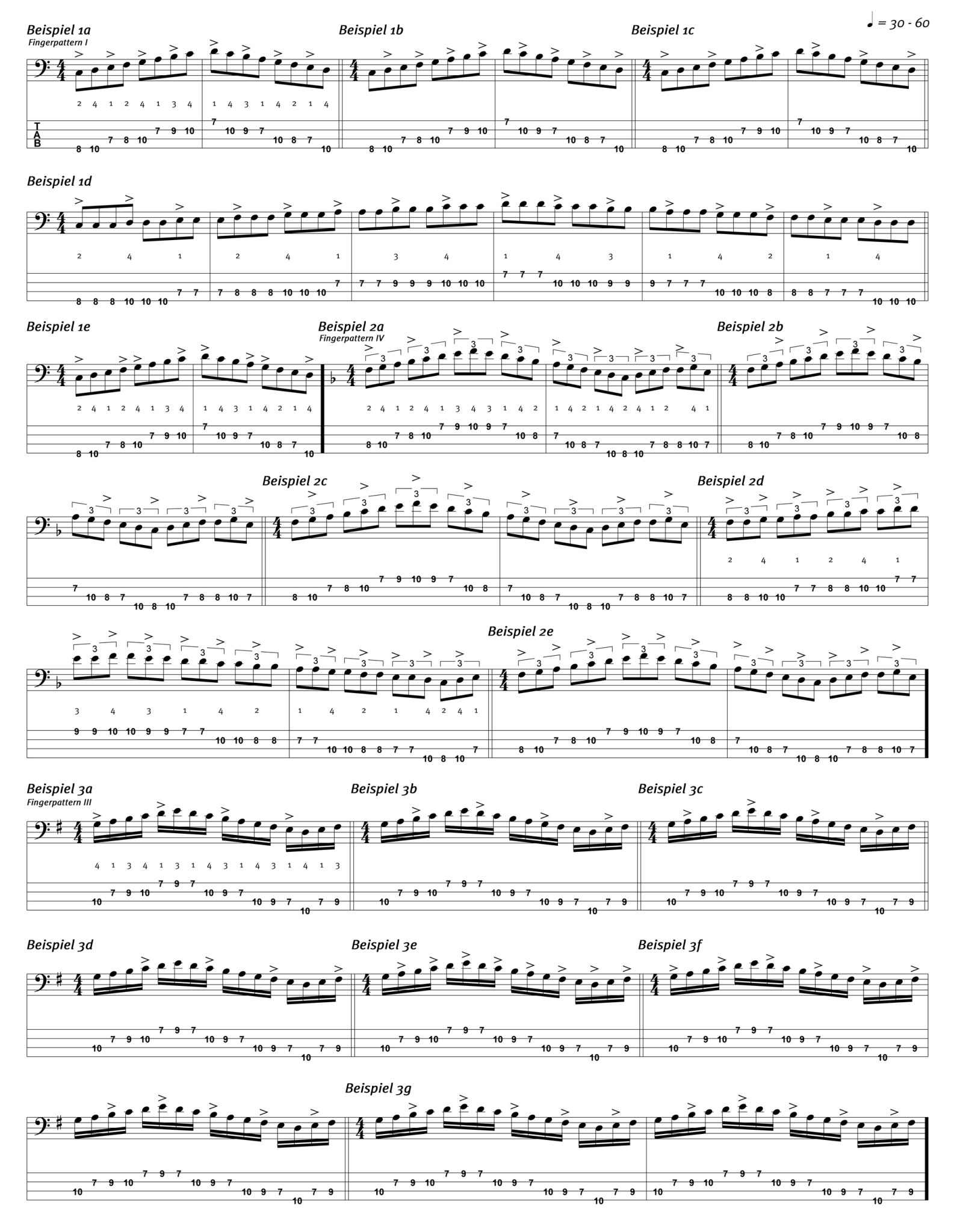 Mit diesen Betonungen trainierst du nicht nur das Spielen des Fingerpatterns und das Verinnerlichen der definierten Fingerkombinationen, sondern auch das exakte und tighte Spiel von Viertelnoten beziehungsweise der Viertel-Zählzeiten sowie des Achtel-Offbeats zum Klick.