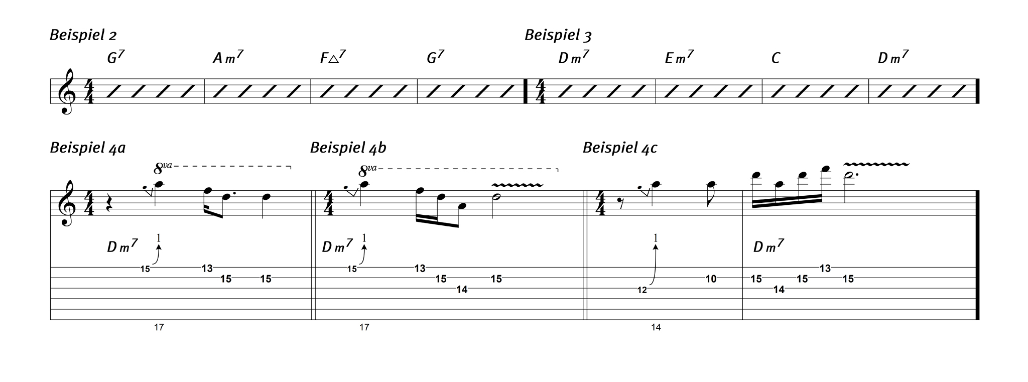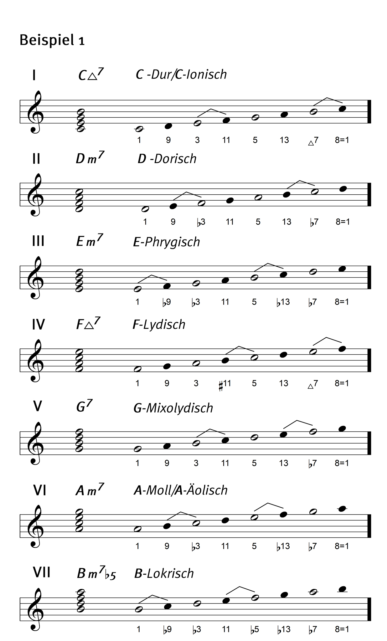 Diesen Tonleitern kann jeweils ihr Stufenakkord zugeordnet werden, womit man automatisch eine passende Skala zum Improvisieren für den jeweiligen Akkord erhält. In Beispiel 1 findest du dies nochmal zusammengefasst.