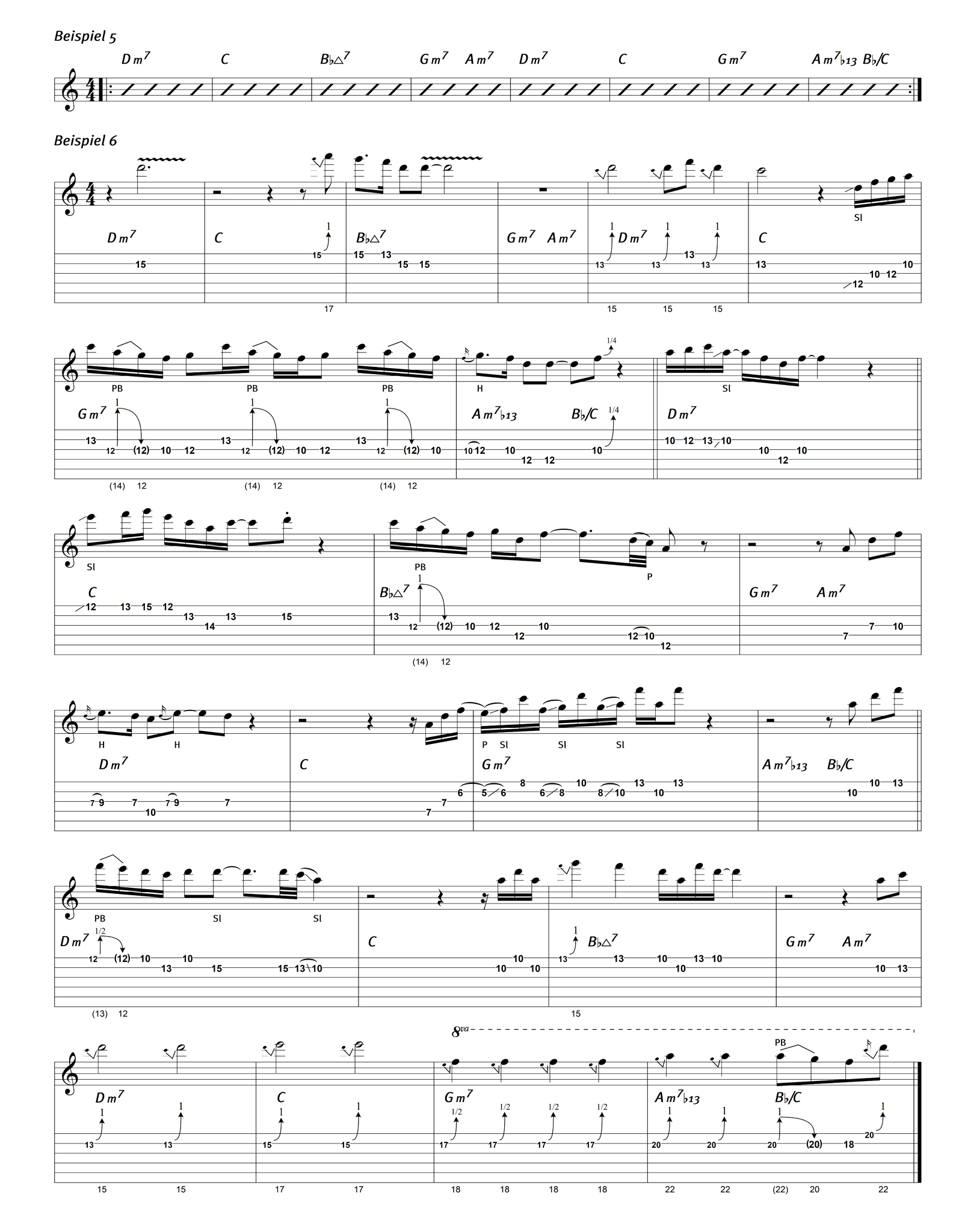 Das Solo (Beispiel 6) ist zwar „nur” 24 Takte lang und kann natürlich nicht diesen enormen Spannungsanstieg des Livesolos nachempfinden, aber ich habe einige Licks und Ideen daraus in diese Episode importiert. Bei diesem Solo kommt es mehr darauf an, wie die Phrasen gesetzt sind und Luft gelassen wird, und weniger darauf, mit welchen Tools gespielt wird (überwiegend D-Blues und ab und zu mal eine None dazu). Viel Spaß damit.