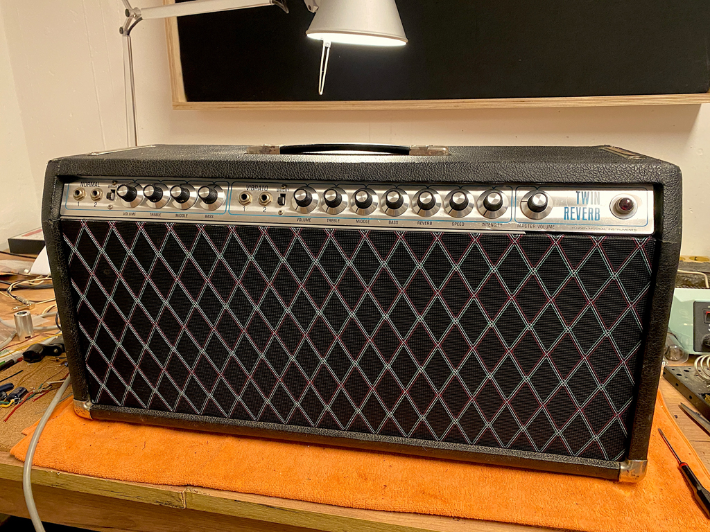 Und weil das so gut gelungen ist, folgte sogleich ein 1973er Twin Reverb, den ich nach demselben Vorbild, jedoch mit Master-Regler, Mittenregler, Tremolo und Hall modifizierte. Wenn man so will, ist das ein Low-Budget-Steel-String-Singer. Ein Verstärker mit einem wirklich monströsen Clean-Sound. Der Amp hat gebraucht nur 900 Euro gekostet und der Umbau hat etwa drei Tage konzentrierte Arbeit in Anspruch genommen.