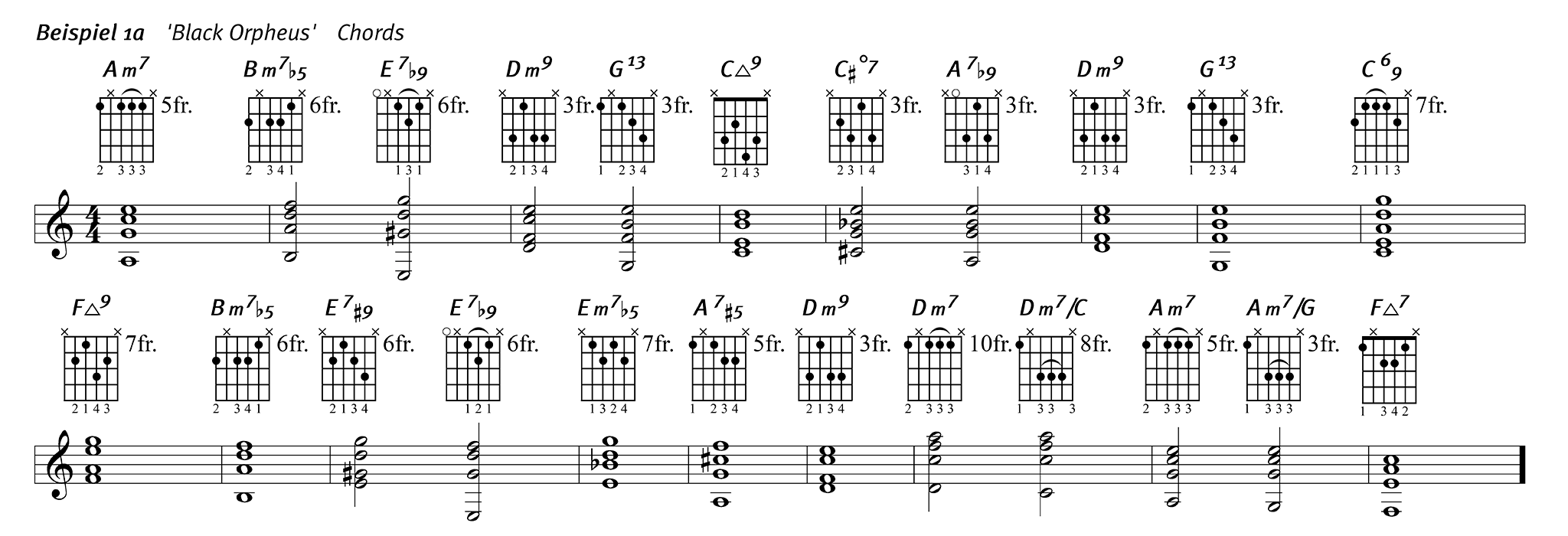 Beispiel 1a zeigt alle Akkord-Voicings, die wir für die Begleitung des Songs brauchen. Es gibt natürlich unzählige Varianten, aber mit diesen Akkorden können wir sowohl im Band-Kontext begleiten als auch nur mit einer Gitarre Basslinie und Akkorde gleichzeitig spielen (Beispiel 1b). Das eignet sich z.B. für Gitarren-Duos, oder auch als Comping für Sängerinnen oder Sänger.