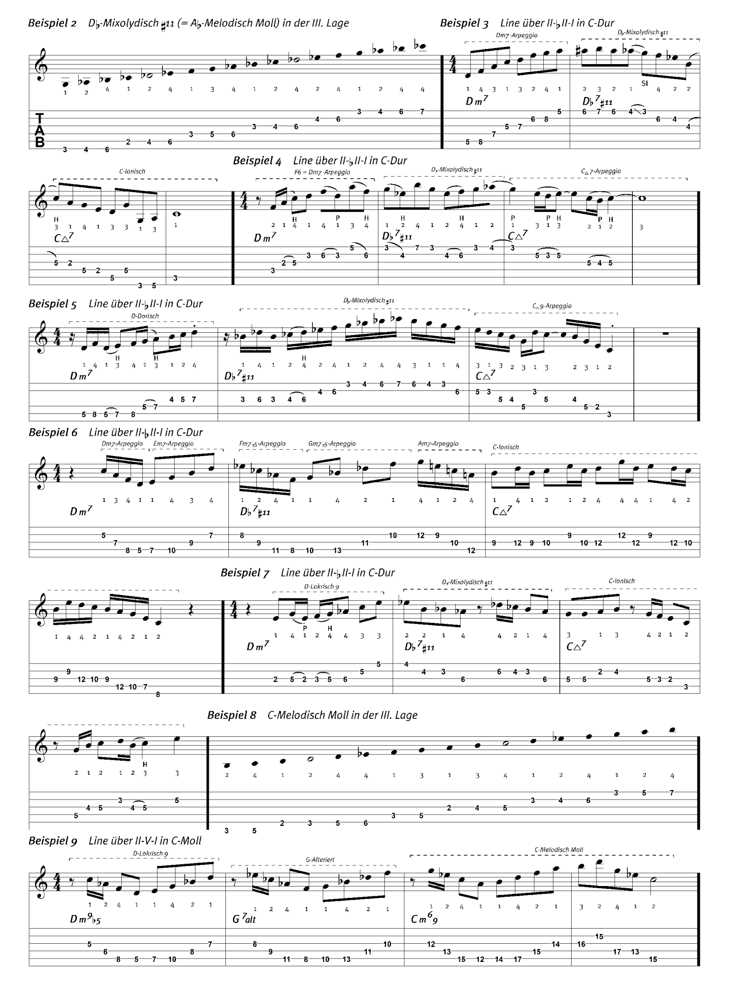 Als Einstieg in den wunderbaren Sound der Tritonus-Substitution findet ihr in Beispiel 1 einige Akkord-Varianten der II-bII-I-Bewegung in C-Dur. Beispiel 2 zeigt Db-Mixolydisch#11 in der III. Lage. Für Beispiel 3, 4, 5, 6, 7 habe ich verschiedene Lines geschrieben, die Db-Mixolydisch#11 innerhalb einer II-bII-I-Bewegung in Action zeigen.