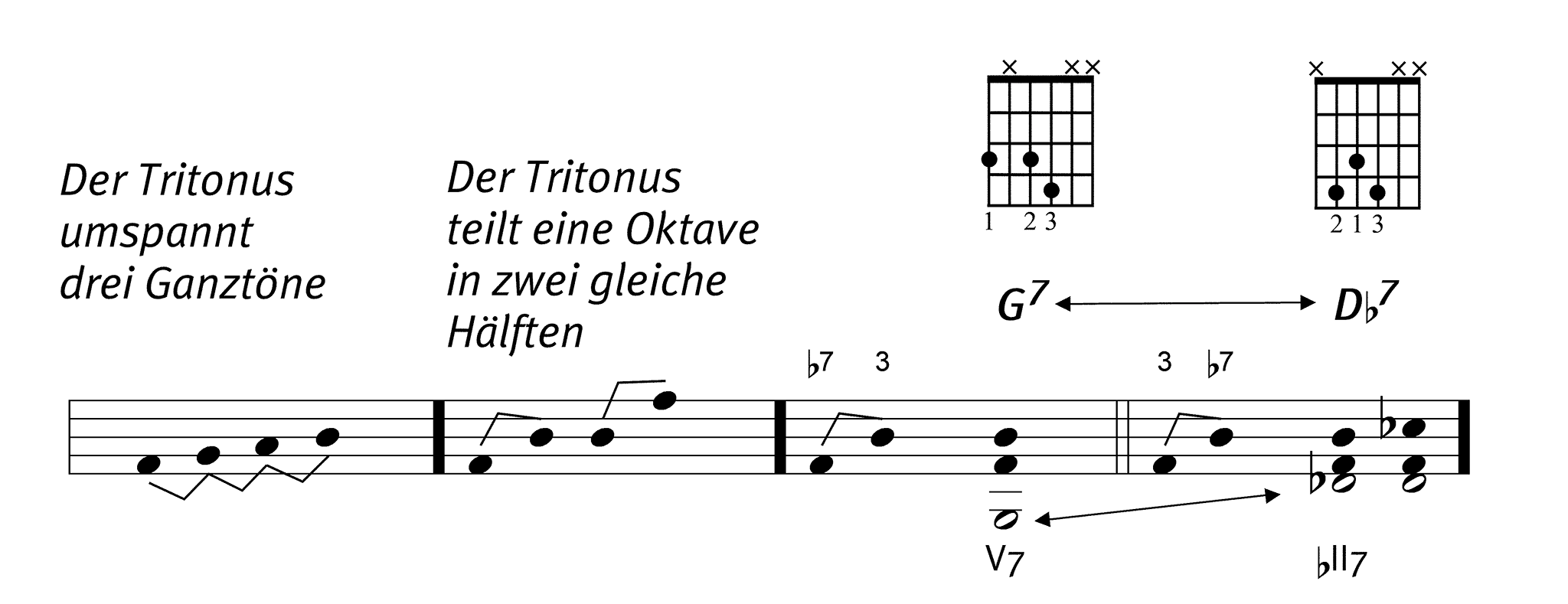 Der in der Dur-Tonleiter so wichtige Dominant-Septakkord − in C-Dur ist das G7 − besteht in seiner Basis-Version aus dem Grundton G, der Terz (3) B, und der kleinen Septime (b7) F. Das Gehör kann ohne Grundton beim Tritonus nicht unterscheiden, ob die kleine Septime oder die Terz oben oder unten ist.